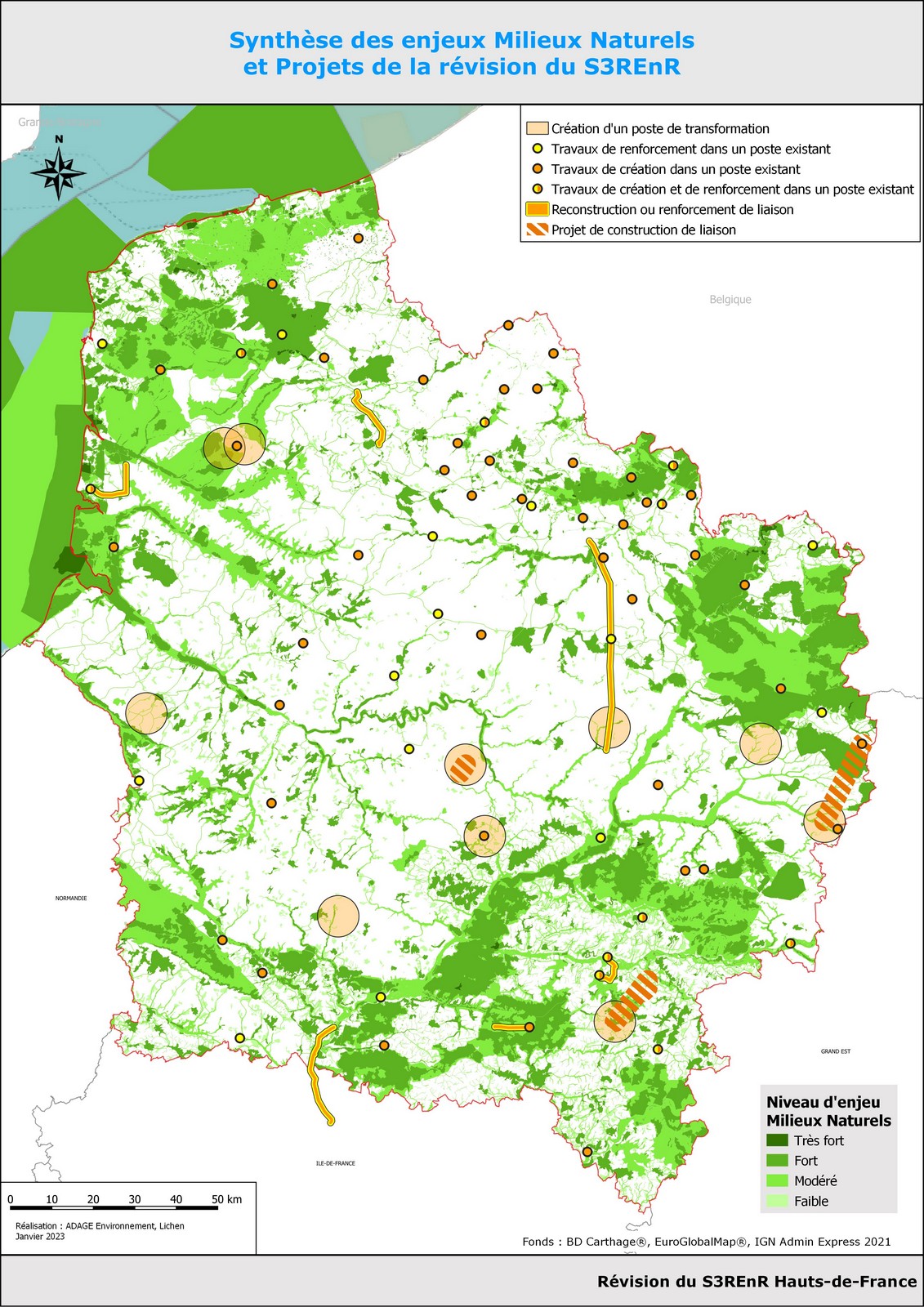 Au regard de cette situation, l’État a retenu comme hypothèse de calcul à moyen terme pour le S3REnR révisé une augmentation de la capacité de raccordement au réseau de l’ordre de 5,5 GW (l’existant correspondant à 8,5 GW raccordés). En concertation avec les acteurs de la filière, RTE a estimé que cela nécessitait notamment la création de 9 nouveaux postes de transformation et de 4 liaisons, répartis sur le territoire régional.