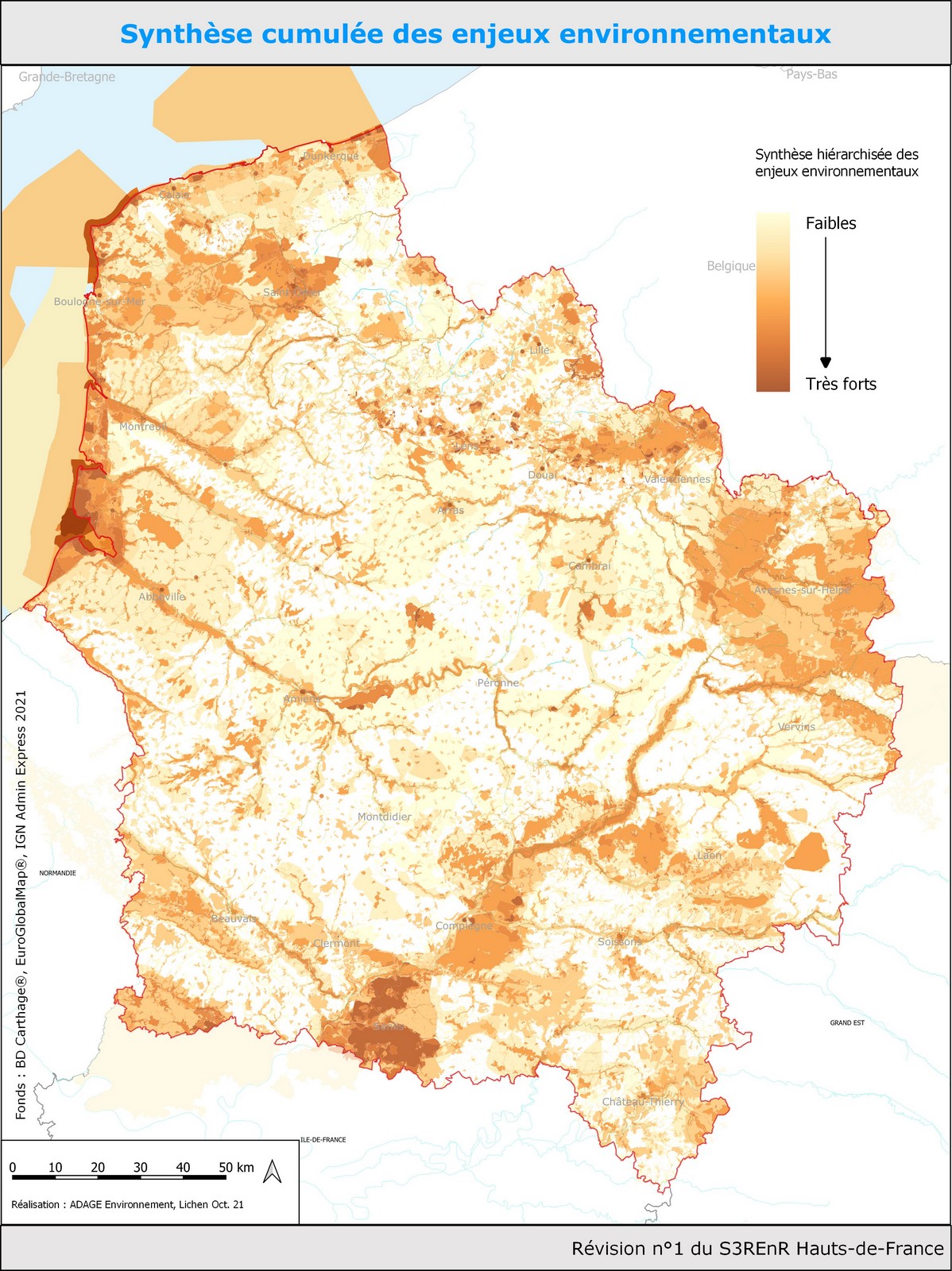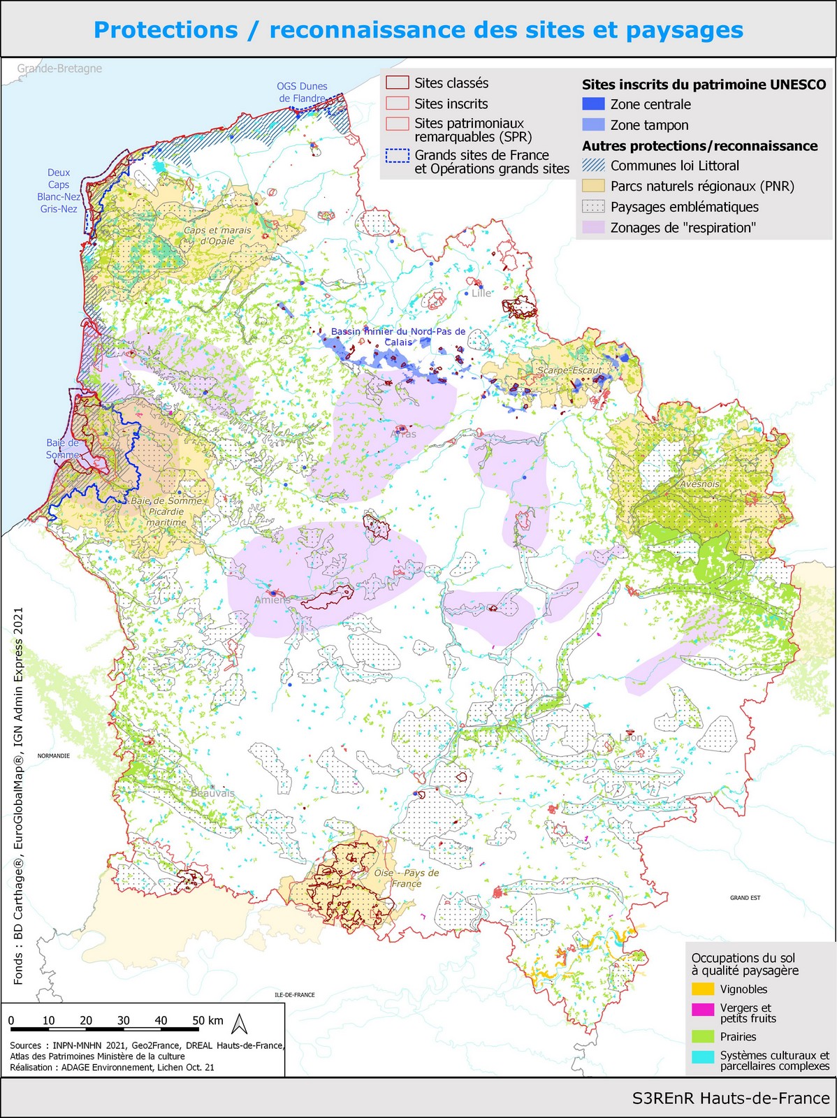 Outre les enjeux environnementaux classiquement pris en compte pour l’évaluation environnementale des S3REnR, cette tension particulière sur l’éolien nous a conduit à inclure dans l’analyse des zonages ad-hoc, fournis par les services de l’Etat : « paysages emblématiques » à préserver et « zones de respiration paysagère » nécessitant une vigilance particulière pour éviter leur dégradation.